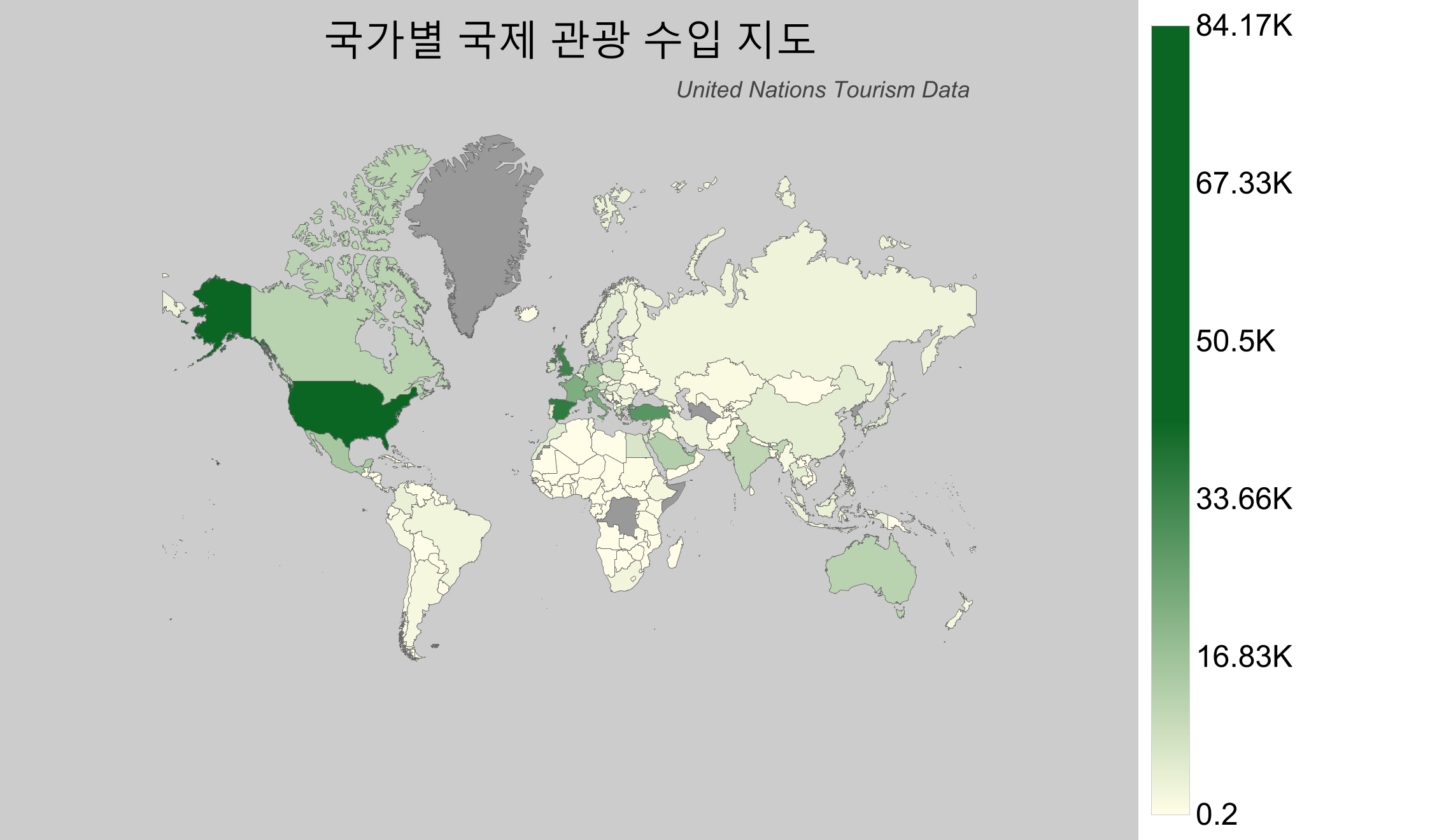 - 한국: 유엔 데이터를 기준으로 관광 수입 순위는 21위로, 약 145억 달러의 수익을 올렸습니다. K-팝, 한류 및 첨단 기술로 관광객을 끌어들이고 있습니다.
